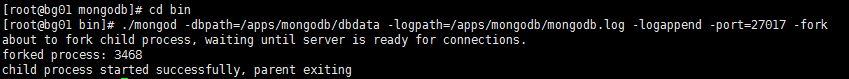 ./mongod -dbpath=/apps/mongodb/dbdata -logpath=/apps/mongodb/mongodb.log -logappend -port=27017 -fork